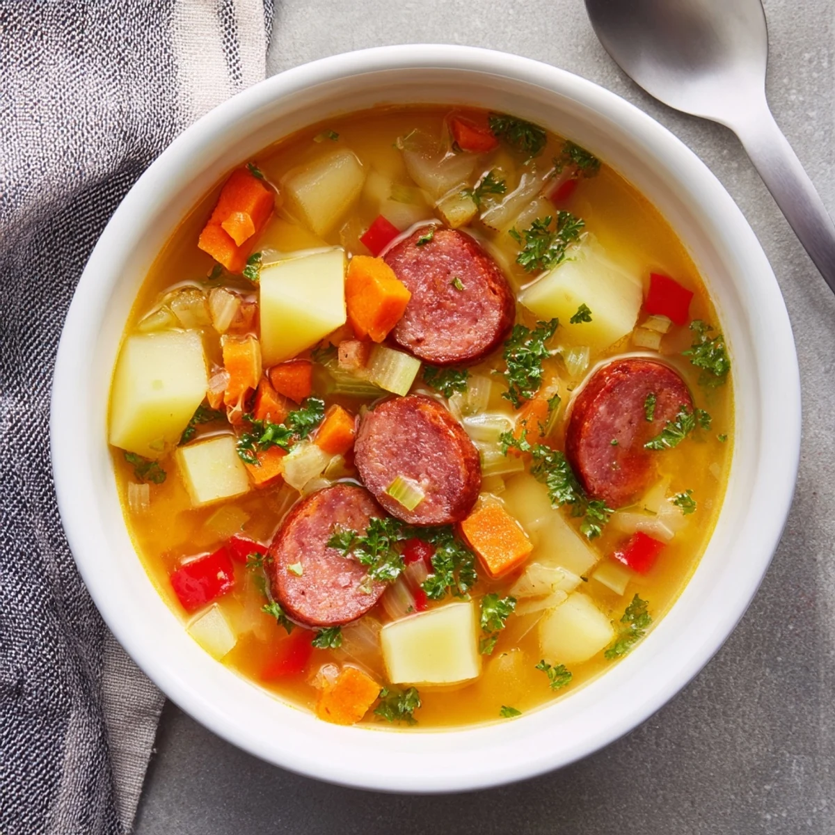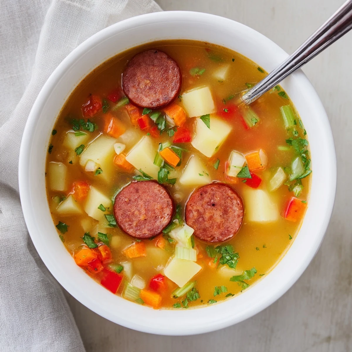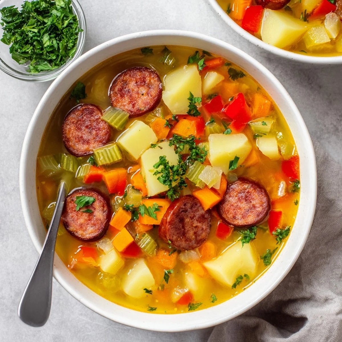 This satisfying Spanish-style soup combines tender Yukon Gold potatoes with smoky chorizo sausage for depth and richness. The aromatic base of onion, garlic, carrot, celery, and red bell pepper builds layers of flavor, while smoked paprika adds authentic Spanish character.