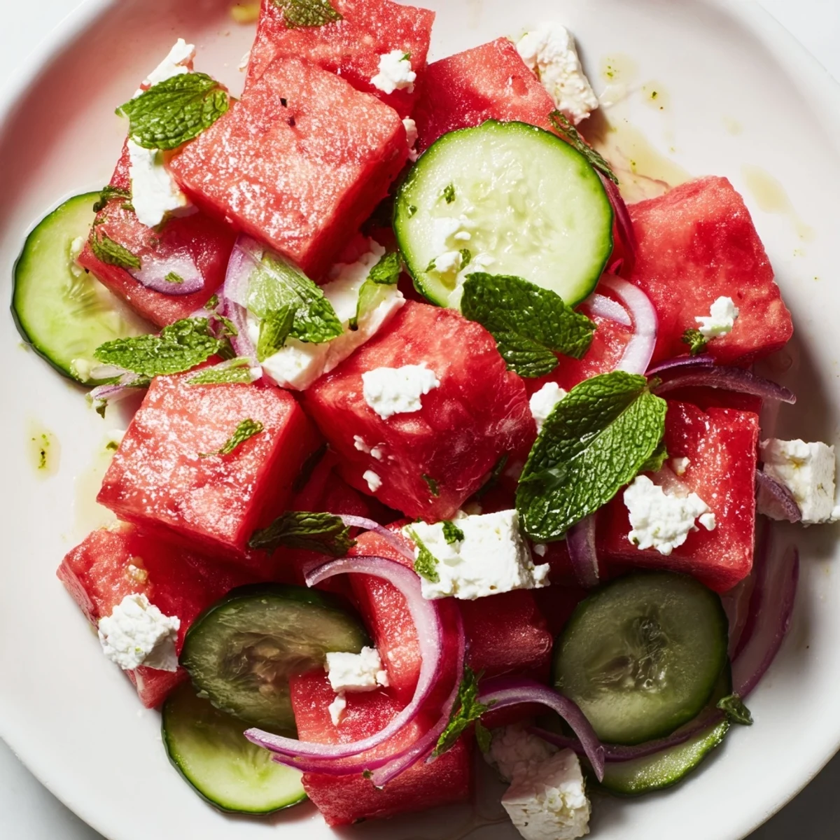 This vibrant summer dish combines juicy seedless watermelon with tangy crumbled feta, crisp cucumber, and aromatic fresh mint. A light honey-lime dressing enhances the natural sweetness while tying the Mediterranean flavors together.